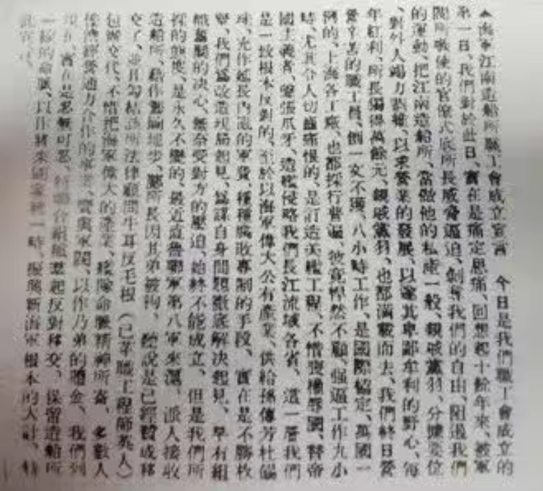 1927年3月21日,上海工人舉行第三次武裝起義,起義勝利后的第二天,在楊培生組織下,江南造船所職工會(huì)成立,并發(fā)布《職工會(huì)宣言》,揭露軍閥與官僚的反動(dòng)面目,喚醒工人奮起斗爭(zhēng)。