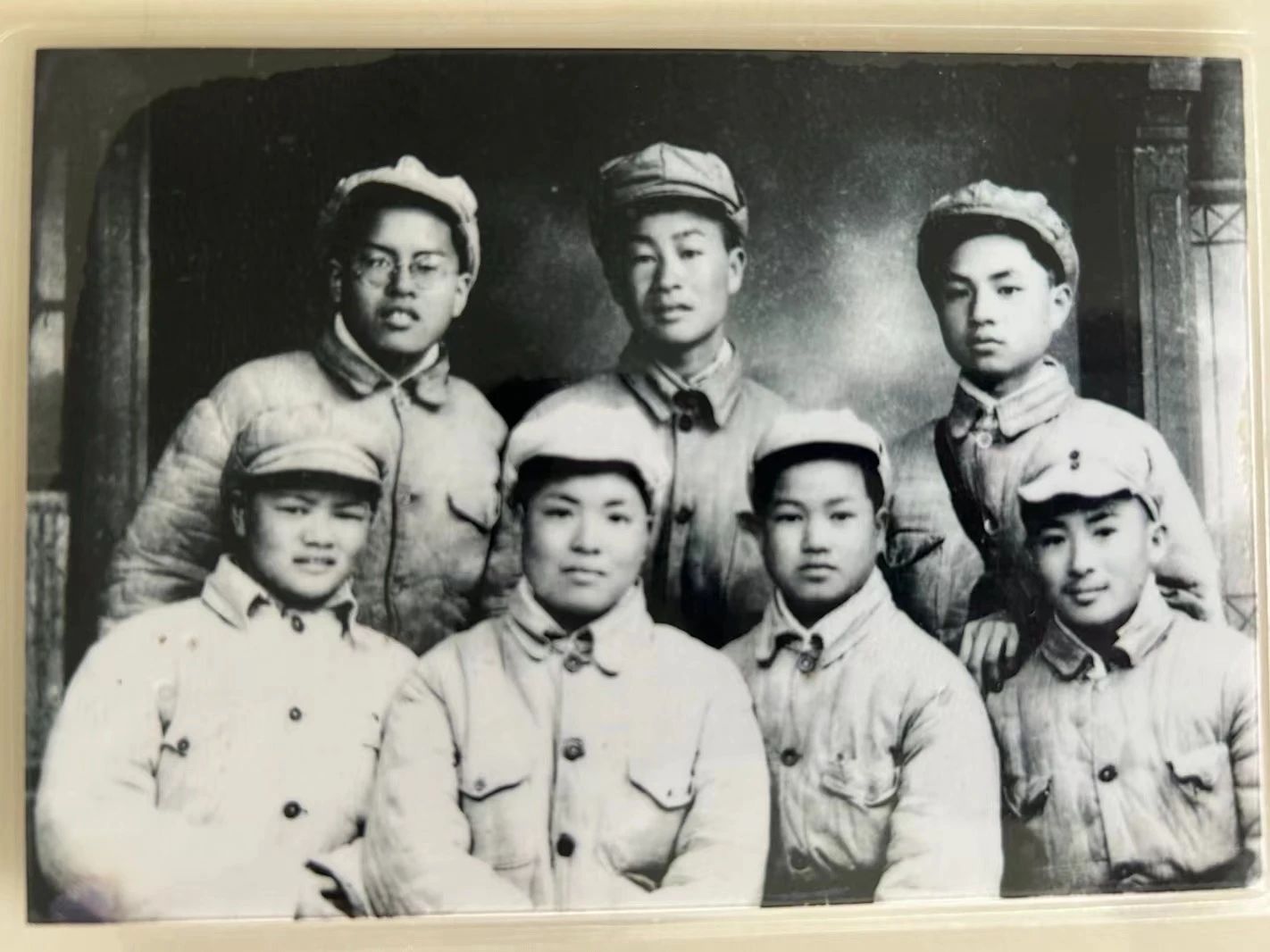 采訪中,劉暉小心地從文件袋中取出一張張老照片,向記者講述背后的故事。其中一張是1949年3月,劉暉與戰(zhàn)友們在部隊休整間隙拍下的合影。她一直珍藏這張照片,畫面中,定格了他們青春年少、英姿颯爽、滿懷革命理想的模樣。
