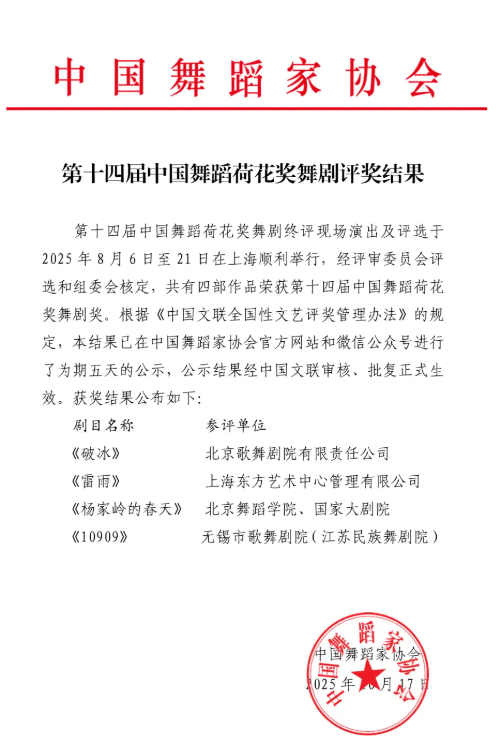 近日,第十四屆中國(guó)舞蹈荷花獎(jiǎng)舞劇獎(jiǎng)評(píng)選結(jié)果揭曉,由無錫市歌舞劇院與中國(guó)船舶集團(tuán)有限公司旗下第七〇二研究所聯(lián)合創(chuàng)作的原創(chuàng)舞劇《10909》從眾多優(yōu)秀作品中脫穎而出,成功摘得荷花獎(jiǎng)舞劇獎(jiǎng)。