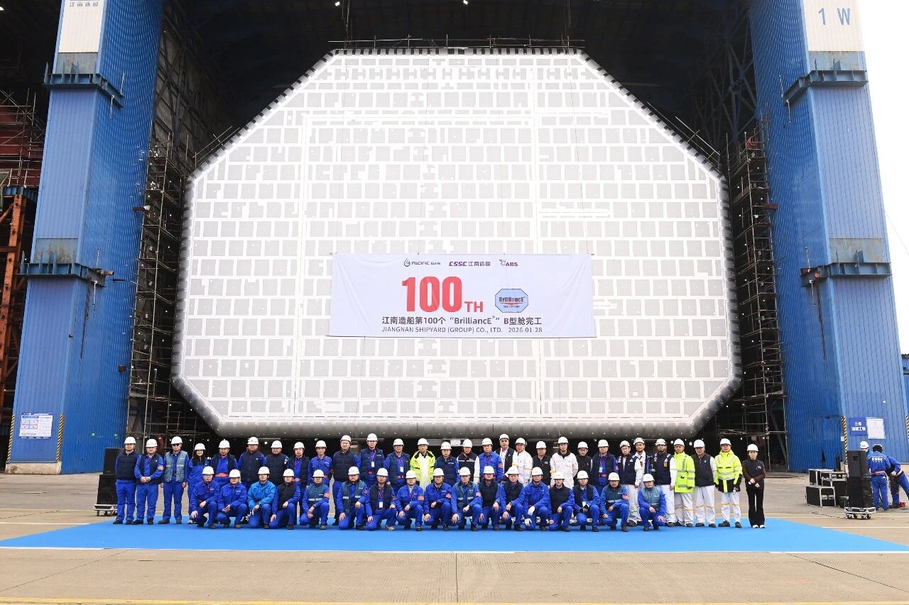 1月28日,中國船舶集團(tuán)有限公司旗下江南造船在10號平臺絕緣安裝場地舉行第100個B型艙完工儀式。自2021年首個B型艙完工至今,歷經(jīng)1700多個日夜的不懈奮斗,江南造船在B型艙圍護(hù)系統(tǒng)與超大型乙烷運(yùn)輸船(VLEC)領(lǐng)域?qū)崿F(xiàn)跨越式發(fā)展,成功打破了國外對低溫圍護(hù)系統(tǒng)的技術(shù)壟斷。
