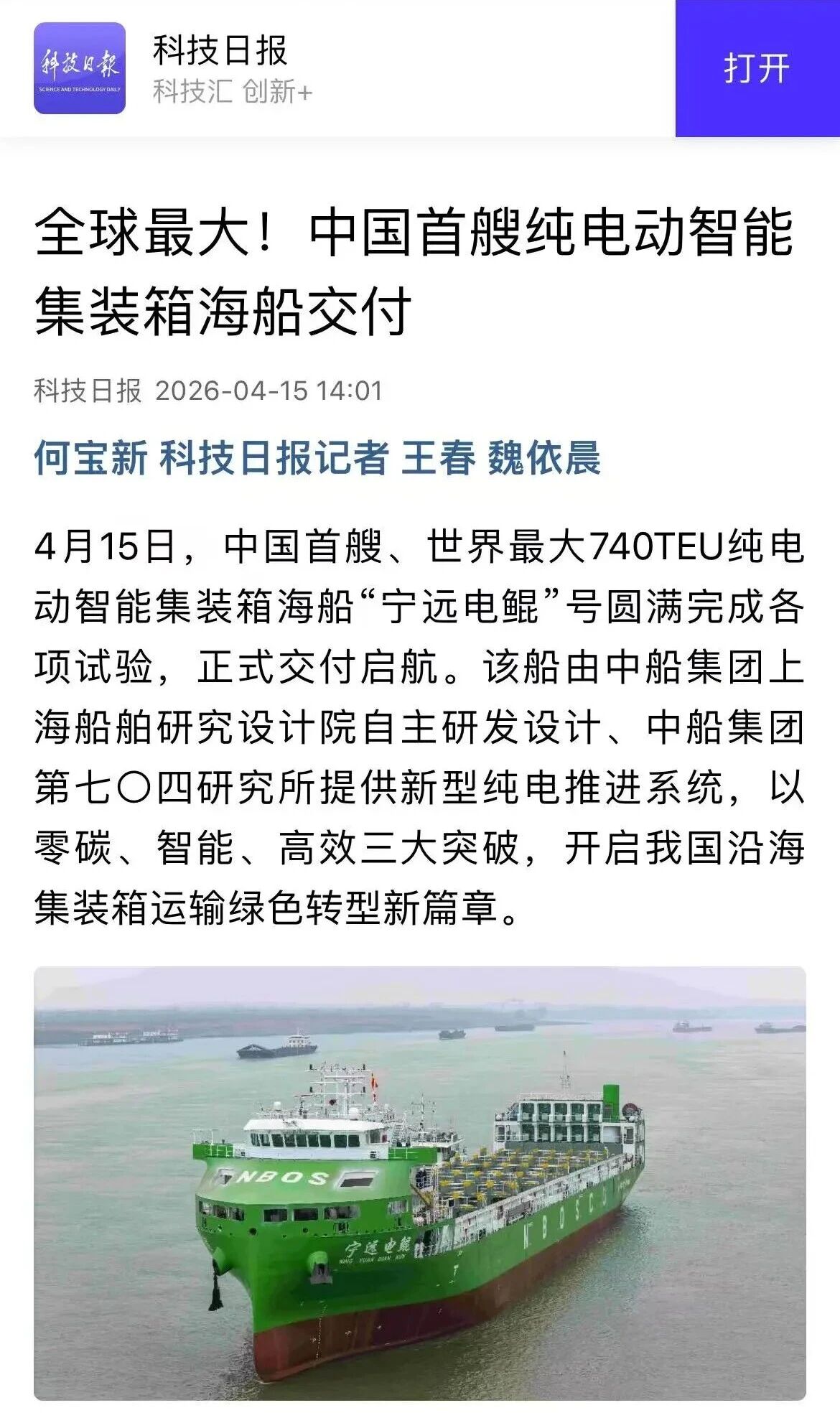 4月15日,由中國船舶集團有限公司旗下六〇四院自主研發設計、七〇四所提供新型純電推進系統的純電動智能敞口集裝箱海船“寧遠電鯤”號正式交付啟航。