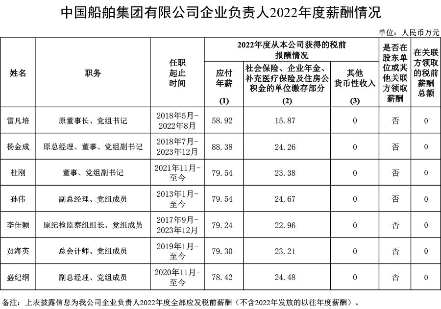 中國船舶集團有限公司企業(yè)負責人2022年度薪酬情況