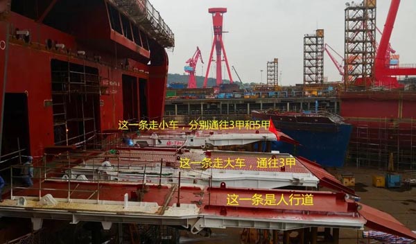 其次,大車停在3甲車庫,小車停在5甲車庫,可使船舶的重心會更低、整體更穩(wěn),最重要的是還考慮到港口條件進(jìn)行了量身定做。