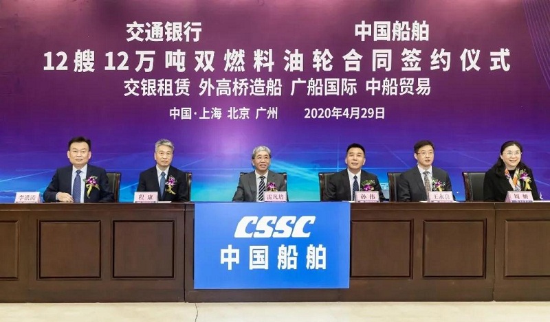 ????4月29日,中國(guó)船舶集團(tuán)有限公司旗下中國(guó)船舶工業(yè)貿(mào)易有限公司、上海外高橋造船有限公司、廣船國(guó)際有限公司與交通銀行股份有限公司旗下交銀金融租賃有限責(zé)任公司在北京、上海、廣州三地以“云簽約”方式簽署12艘12萬(wàn)噸雙燃料油船建造合同,合同總金額約46億元人民幣,這是中國(guó)船舶集團(tuán)旗下單位近期承接的又一單筆大額訂單。中國(guó)船舶集團(tuán)黨組書記、董事長(zhǎng)雷凡培,交通銀行黨委書記、董事長(zhǎng)任德奇,中國(guó)船舶集團(tuán)黨組成員、副總經(jīng)理孫偉,交通銀行黨委委員、副行長(zhǎng)呂家進(jìn)出席簽約儀式。