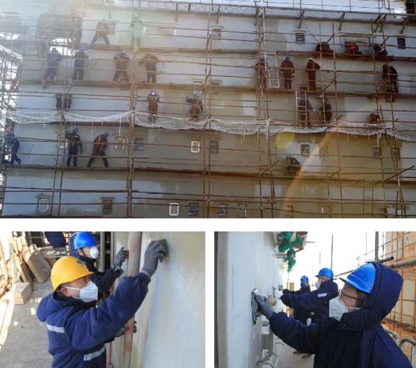 試航歸來,后續(xù)工作緊鑼密鼓地展開。項(xiàng)目組周密安排,對交船前所有工作進(jìn)行全面梳理;項(xiàng)目組管理人員扎根一線,靠前指揮,保障了生產(chǎn)進(jìn)度的有序推進(jìn)。當(dāng)船東要求對外板區(qū)域進(jìn)行翻新時,大船集團(tuán)山船重工第一時間安排泊位,僅用2天時間就完成了外板翻新工作,受到船東及運(yùn)營公司的好評。