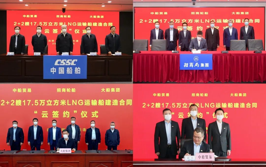 3月31日,中國(guó)船舶集團(tuán)有限公司旗下大船集團(tuán)聯(lián)合中船貿(mào)易與招商局集團(tuán)有限公司旗下招商輪船在上海、深圳、大連及北京四地以“云簽約”方式簽署2+2艘17.5萬(wàn)立方米大型液化天然氣(LNG)運(yùn)輸船建造合同。中國(guó)船舶集團(tuán)黨組書記、董事長(zhǎng)雷凡培,黨組副書記、總經(jīng)理?xiàng)罱鸪桑h組成員、副總經(jīng)理盛紀(jì)綱,招商局集團(tuán)董事長(zhǎng)繆建民、總經(jīng)理胡建華、董事王宏出席簽約儀式。雷凡培、繆建民在儀式上致辭。