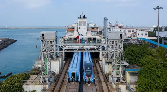 但是,問題來了,200多米長的復興號如何過海到達海南島呢?這就需要依靠粵海鐵路渡船幫助復興號過海了。首先要把動車組“解體”,然后推入粵海鐵路渡船,分解車鉤、風擋、車端連接線,掛過渡車鉤,從車廂連接處進行拆解,送到對岸后再復編組合。