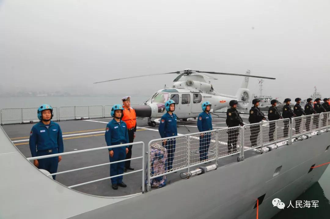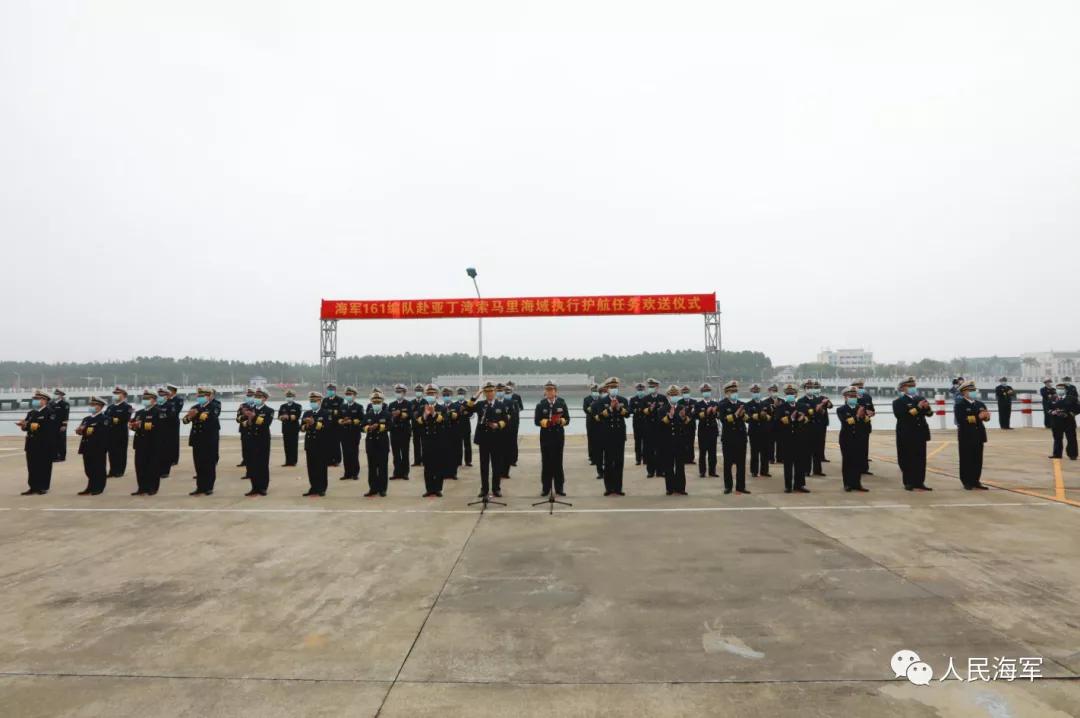 軍樂(lè)隊(duì)奏響《歡送進(jìn)行曲》,編隊(duì)艦艇依次解纜,緩緩駛離碼頭,任務(wù)官兵整齊列隊(duì)、士氣高昂,向祖國(guó)和人民揮手告別。