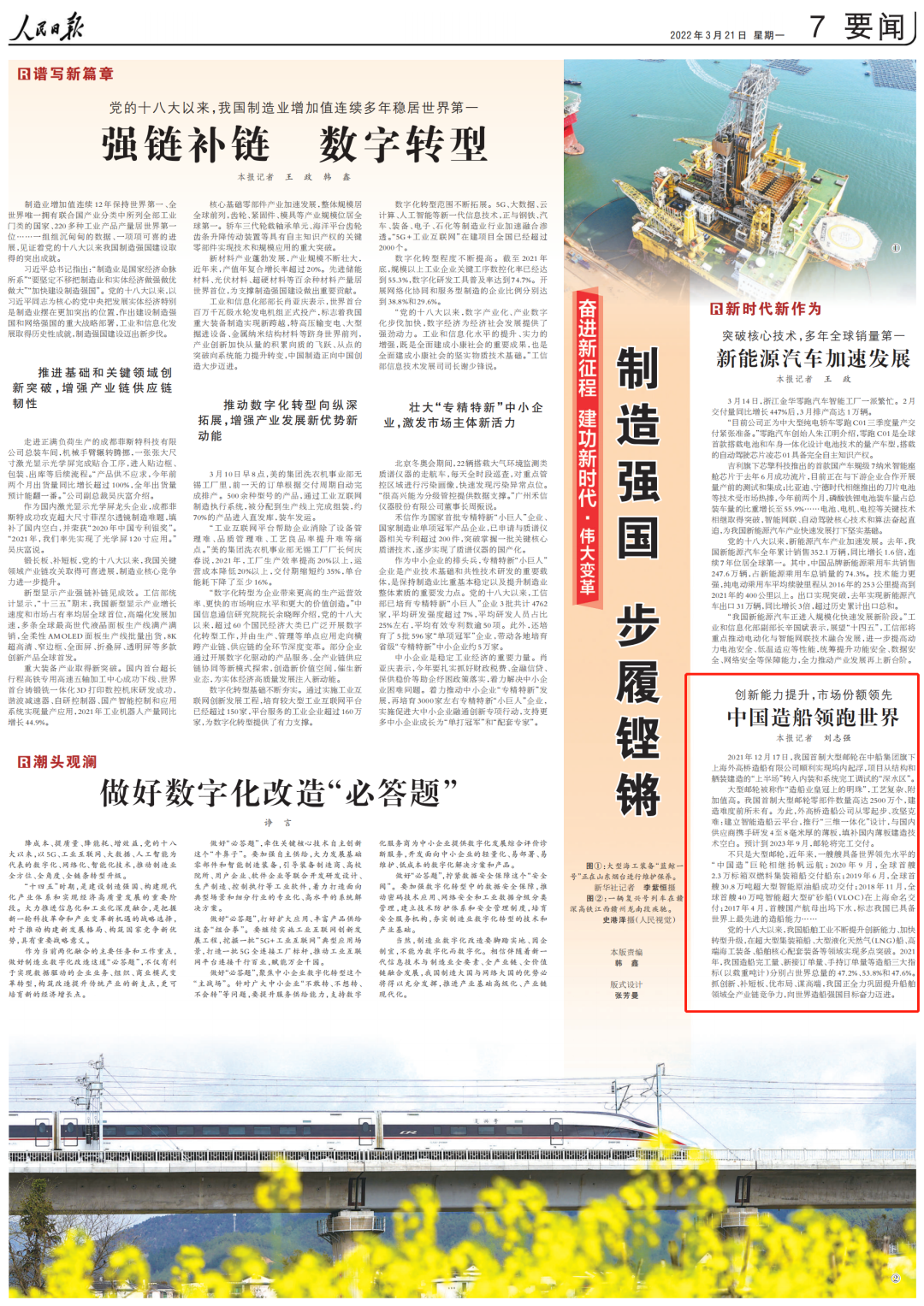 黨的十八大以來,我國船舶工業(yè)不斷提升創(chuàng)新能力、加快轉(zhuǎn)型升級(jí),在超大型集裝箱船、大型液化天然氣(LNG)船、高端海工裝備、船舶核心配套裝備等領(lǐng)域?qū)崿F(xiàn)多點(diǎn)突破。2021年,我國造船完工量、新接訂單量、手持訂單量等造船三大指標(biāo)(以載重噸計(jì))分別占世界總量的47.2%、53.8%和47.6%。抓創(chuàng)新、補(bǔ)短板、優(yōu)布局、謀高端,我國正全力鞏固提升船舶領(lǐng)域全產(chǎn)業(yè)鏈競爭力,向世界造船強(qiáng)國目標(biāo)奮力邁進(jìn)。