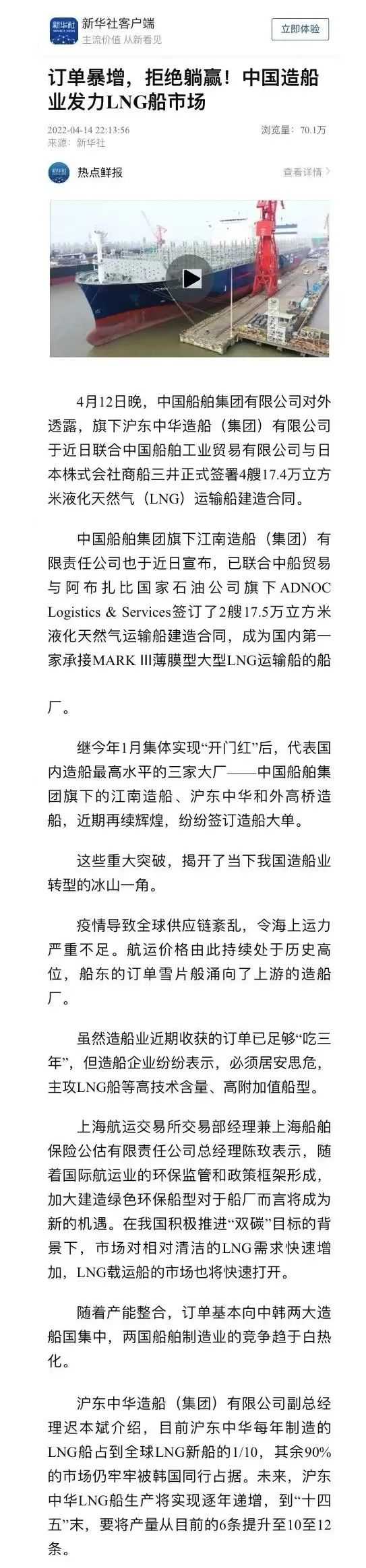 近日,新華社以《訂單暴增,拒絕躺贏!中國造船業(yè)發(fā)力LNG船市場》為題,關(guān)注了中國船舶集團(tuán)發(fā)力LNG船市場接連簽訂造船大單的重大突破!