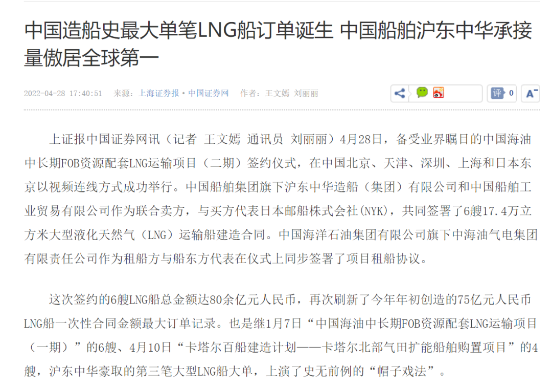 這次簽約生效的6艘LNG船總金額達(dá)80余億元人民幣,再次刷新了今年年初創(chuàng)造的LNG船一次性合同金額最大訂單紀(jì)錄。至此,今年前4個月滬東中華已累計承接LNG船訂單達(dá)到創(chuàng)歷史紀(jì)錄的17艘,超越韓國船企傲居全球之首,在實現(xiàn)簽單質(zhì)量和數(shù)量“雙提升”的同時,進(jìn)一步鞏固了滬東中華在中國LNG產(chǎn)業(yè)鏈的龍頭地位和領(lǐng)跑優(yōu)勢。