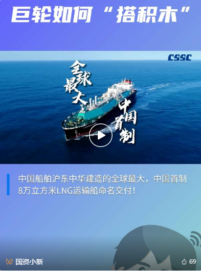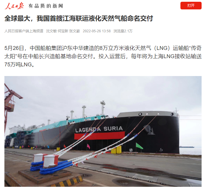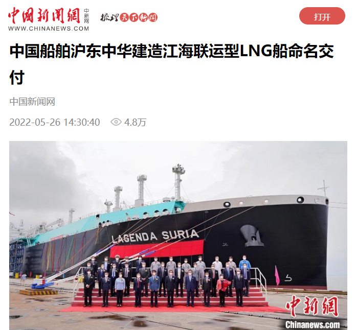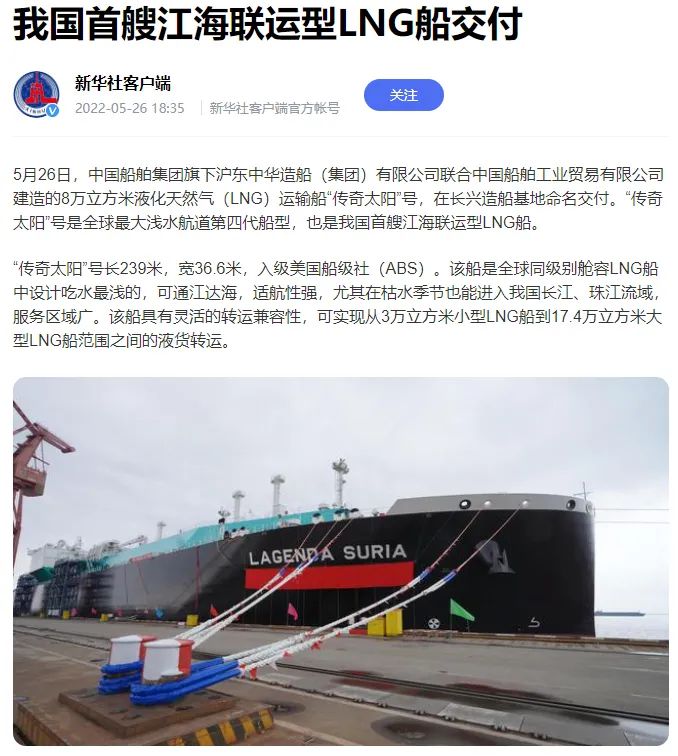 5月26日,中國船舶集團旗下滬東中華聯(lián)合中船貿(mào)易建造的8萬立方米液化天然氣(LNG)運輸船“傳奇太陽”號在長興造船基地命名交付。“傳奇太陽”號是全球最大淺水航道第四代、我國首款首制首艘江海聯(lián)運型LNG船,填補了中國淺水航道LNG船的空白,在該細分市場占有率最高,有望成為中國船舶制造的又一精品船型。