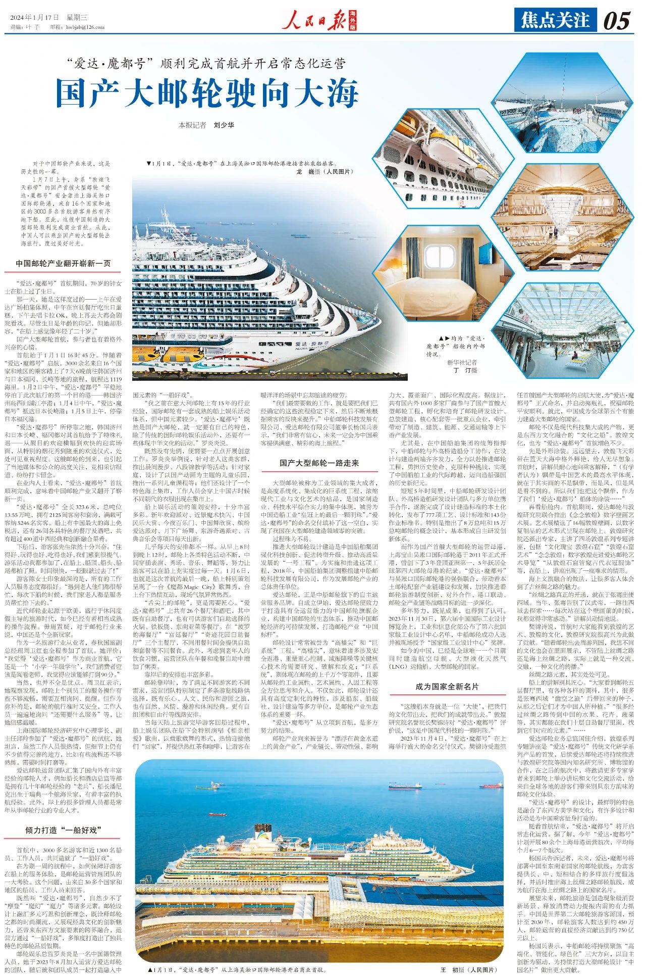 1月17日,人民日報海外版第五版焦點關注刊發(fā)整版文章,聚焦“愛達·魔都號”。
