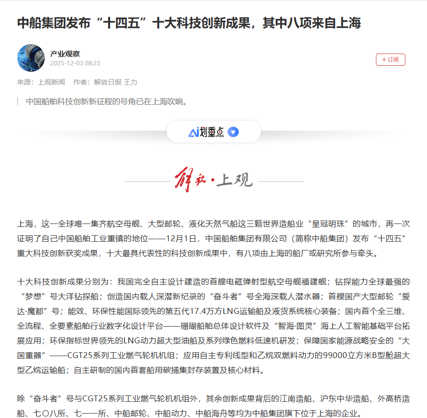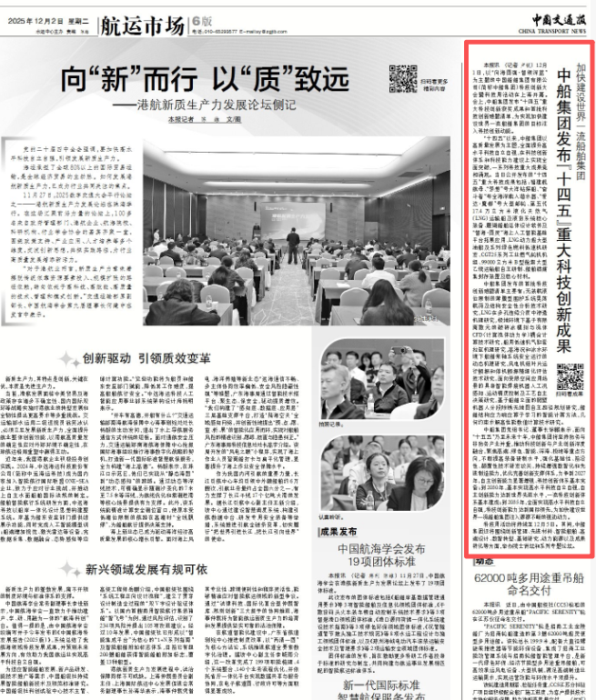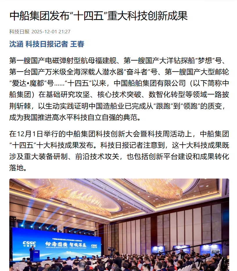 此次大會聚焦“向海圖強·智領深藍”主題,系統(tǒng)總結(jié)了中船集團“十四五”期間科技創(chuàng)新工作及重大科技創(chuàng)新成果,謀劃“十五五”科技發(fā)展規(guī)劃,引發(fā)中央、行業(yè)及地方媒體的廣泛關注報道。