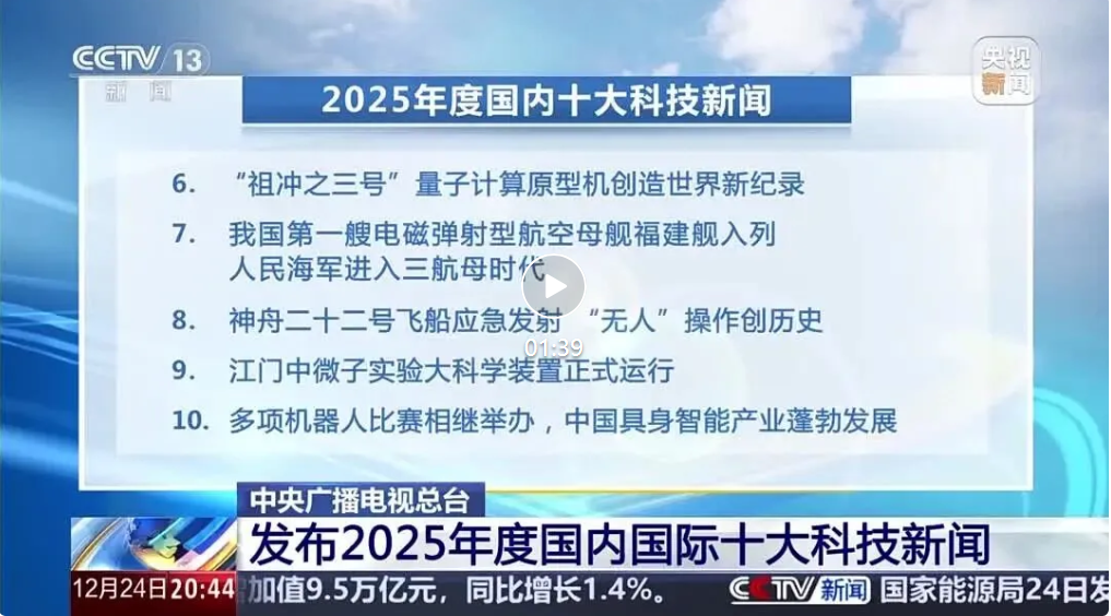 12月24日,中央廣播電視總臺(tái)發(fā)布2025年度國(guó)內(nèi)十大科技新聞,我國(guó)第一艘電磁彈射型航空母艦福建艦入列人民海軍進(jìn)入三航母時(shí)代位列其中。