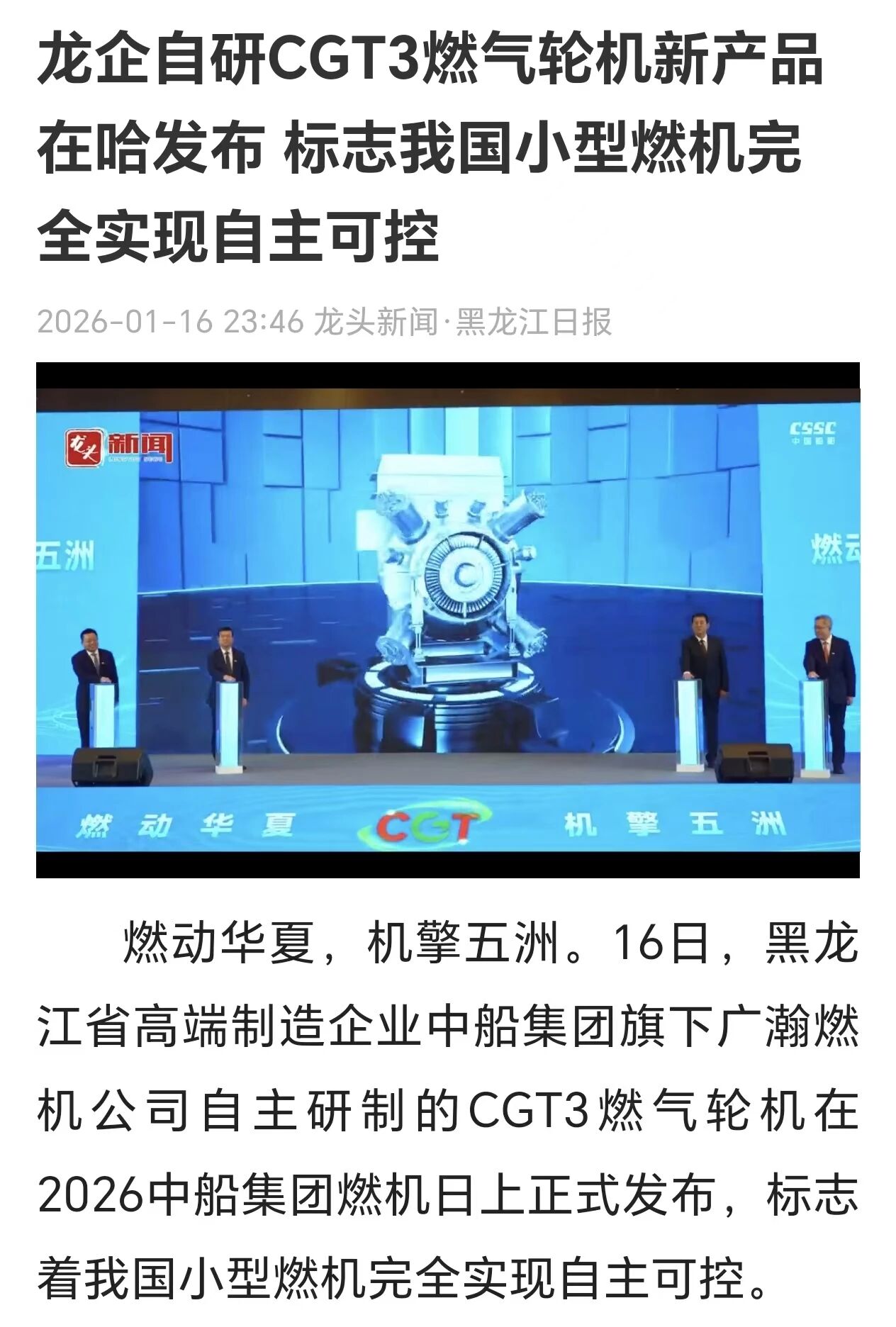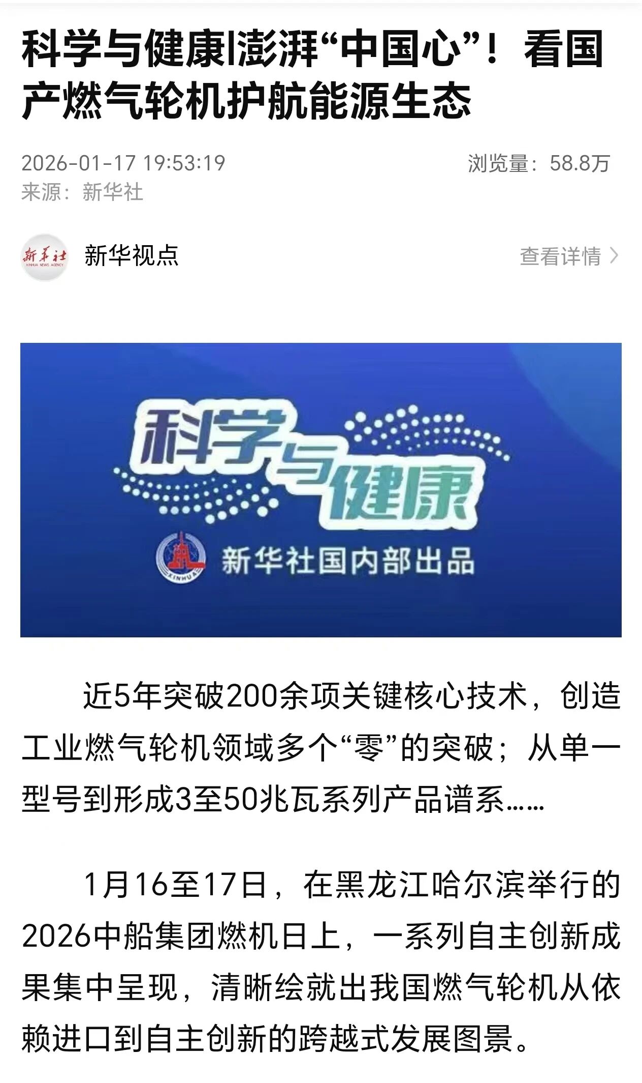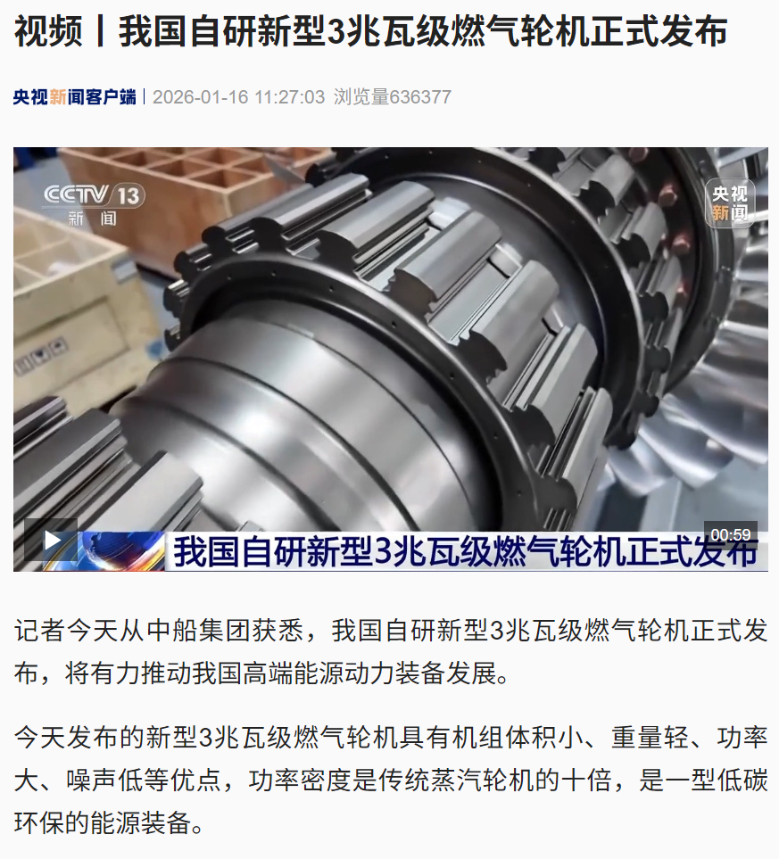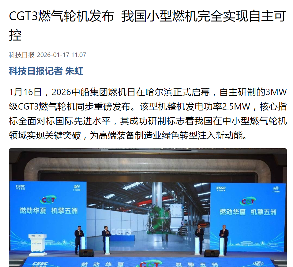 燃動(dòng)華夏 機(jī)擎五洲。1月16日-17日,2026中船集團(tuán)燃機(jī)日活動(dòng)在黑龍江哈爾濱舉行,由中船集團(tuán)七〇三所自主研制的CGT3燃?xì)廨啓C(jī)在活動(dòng)期間重磅發(fā)布。CGT3燃?xì)廨啓C(jī)核心指標(biāo)全面對(duì)標(biāo)國際先進(jìn)水平,其成功研制標(biāo)志著我國在中小型燃?xì)廨啓C(jī)領(lǐng)域?qū)崿F(xiàn)關(guān)鍵突破,活動(dòng)引發(fā)新華社、央視、科技日?qǐng)?bào)、黑龍江日?qǐng)?bào)等多家中央及地方媒體關(guān)注報(bào)道。