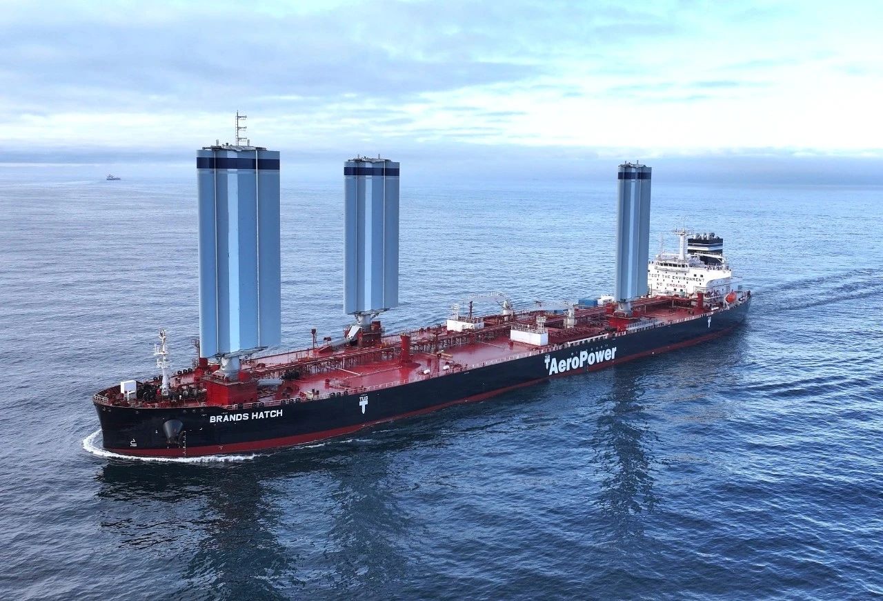 風(fēng)能作為一種可再生能源,以其高性價比成為業(yè)內(nèi)研究船舶推力的新方向。“BRANDSHATCH”號以將傳統(tǒng)風(fēng)能轉(zhuǎn)化為智能化現(xiàn)代推進力為核心技術(shù)顛覆點,配備三具高度超過40米的硬質(zhì)翼型風(fēng)帆,在航行中能夠依托數(shù)字控帆系統(tǒng)根據(jù)氣象數(shù)據(jù)實現(xiàn)實時智能動態(tài)調(diào)整帆角,通過機械液壓傳動系統(tǒng)實現(xiàn)升降、開合和旋轉(zhuǎn),為船舶提供額外推力,從而大幅減少主機的燃油消耗,有效提升船舶運營效能。